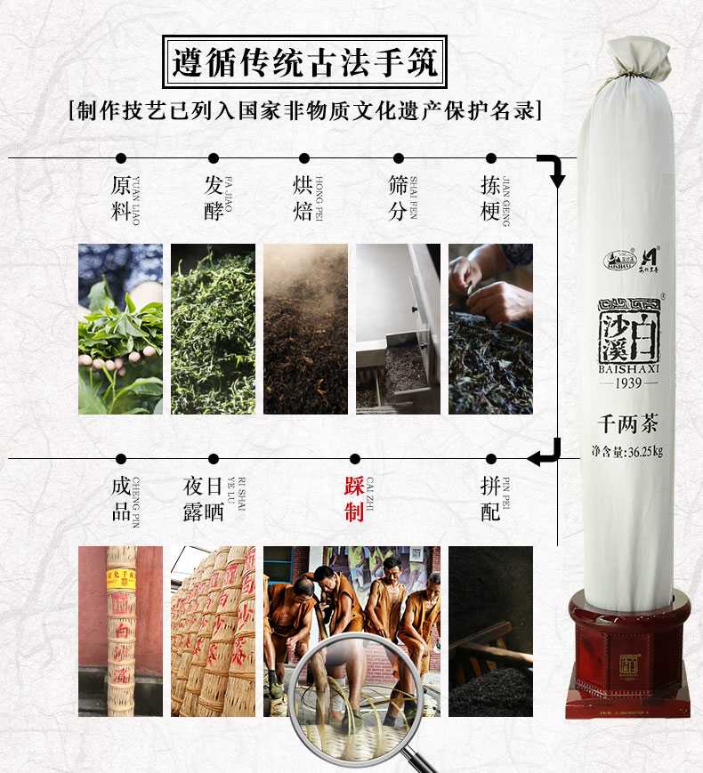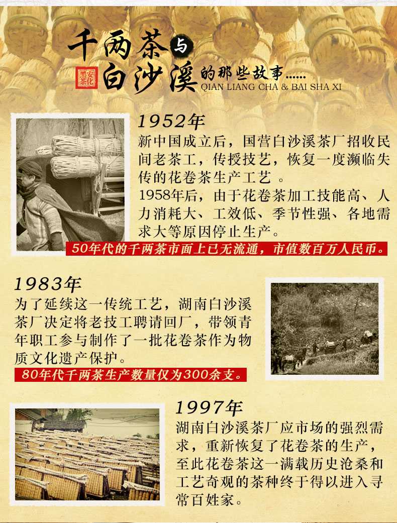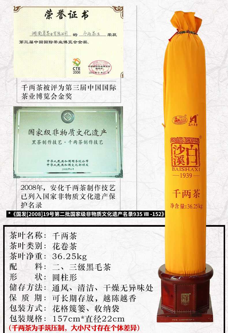 白沙溪茶廠創(chuàng)建于1939年,創(chuàng)造歷史上第一片黑磚、花磚和茯磚,1956年被評(píng)為全國(guó)五個(gè)優(yōu)秀茶廠之一,“千兩茶手工制作技藝”列入國(guó)家級(jí)非物質(zhì)文化遺產(chǎn)保護(hù)名錄。白沙溪分湘尖、千兩茶、茯磚、黑磚、花磚五大系列,主要以安化大葉種茶為原料,內(nèi)含物豐富,其傳統(tǒng)加工工藝被納入國(guó)家級(jí)非物質(zhì)文化遺產(chǎn)名錄,每泡茶葉可沖泡20次,具有明顯的降脂降壓、消油解膩功效。2010年,白沙溪牌被評(píng)選為“中國(guó)世博十大名茶”·2010年,白沙溪牌被選為第十六屆廣..