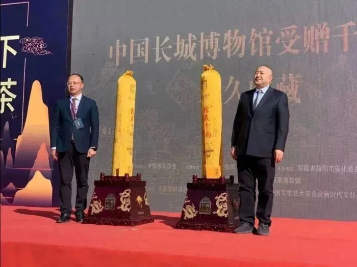 圖為2020年10月,時(shí)任湖南安化縣委書記劉勇會(huì)向中國長城博物館贈(zèng)送白沙溪館藏千兩茶