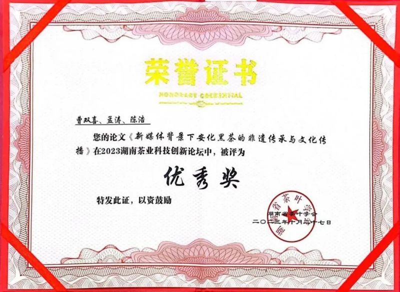 會(huì)上,對(duì)湖南省茶葉學(xué)會(huì)2023年度獲獎(jiǎng)?wù)撐倪M(jìn)行了頒獎(jiǎng)。白沙溪選送的論文《新媒體背景下安化黑茶的非遺傳承與文化傳播》被評(píng)為優(yōu)秀獎(jiǎng)。