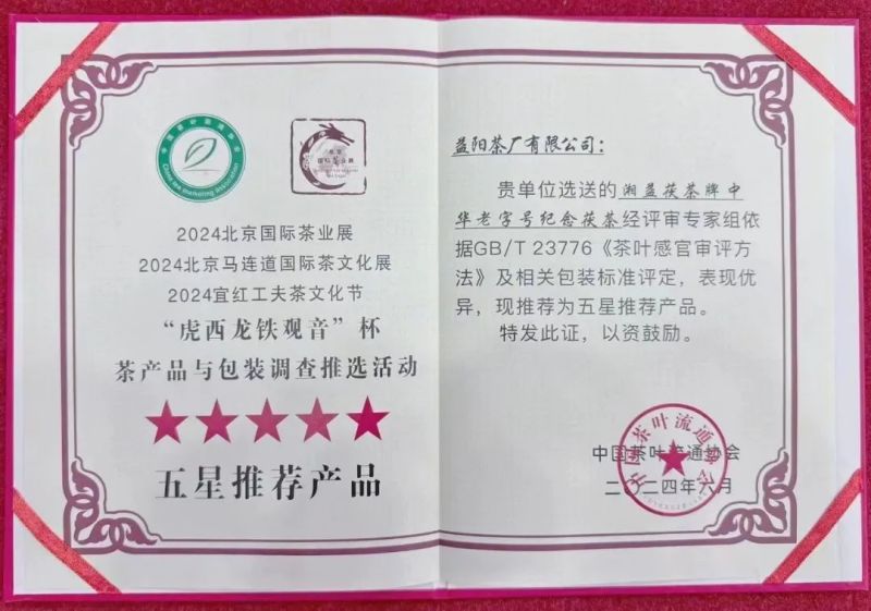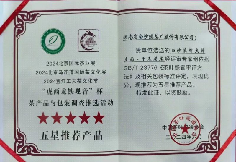 此外,集團(tuán)公司多款產(chǎn)品在“兩展一節(jié)”茶產(chǎn)品與包裝調(diào)查推選活動(dòng)中榮獲星級(jí)推薦產(chǎn)品、推薦茶包裝。其中,白沙溪茶廠黑茶產(chǎn)品“大師莊園·甲辰茯茶”、益陽(yáng)茶廠黑茶產(chǎn)品“中華老字號(hào)紀(jì)念茯茶”、湘茶高科深加工產(chǎn)品輕輕茶“國(guó)貨優(yōu)品黑茶固體飲料”、茶守藝代用茶產(chǎn)品“暴打油金花黑茶(嗨吃無(wú)憂裝)”榮獲“五星推薦產(chǎn)品”、“推薦茶包裝”;茶守藝黃茶產(chǎn)品“君山遠(yuǎn)黛”、茶葉博物館綠茶產(chǎn)品“黃金茶1號(hào)”榮獲“五星推薦產(chǎn)品”;瀟湘茶業(yè)綠茶產(chǎn)品“保靖黃金茶”榮獲“四星推薦產(chǎn)品”;茶守藝綠茶產(chǎn)品“沙水茗間”、瀟湘茶業(yè)綠茶產(chǎn)品“保靖黃金茶”榮獲“推薦茶包裝”。