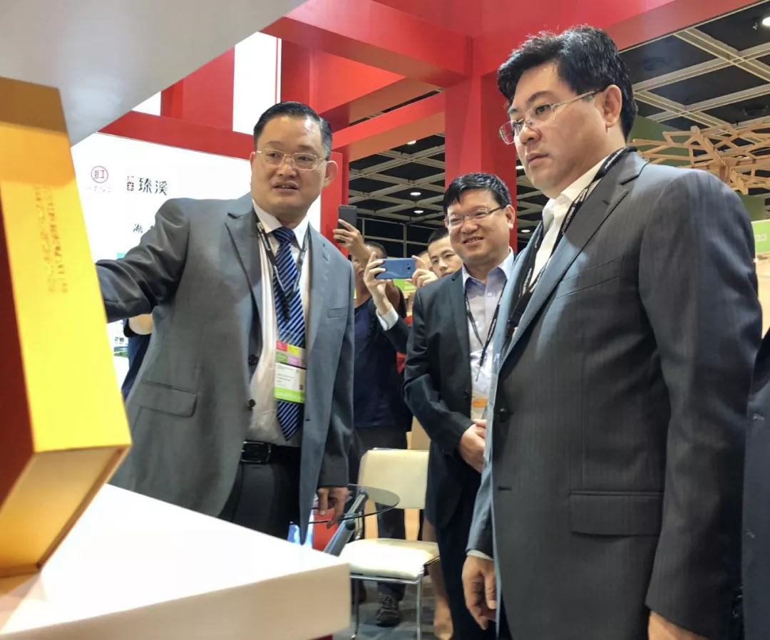 省人民政府副省長隋忠誠(前排右二)來到湘益展位參觀,公司董事長周重旺(左一)、公司副董事長彭雄根(前排右一)、湘益茯茶香港經(jīng)銷商李博坤(前排右三)陪同