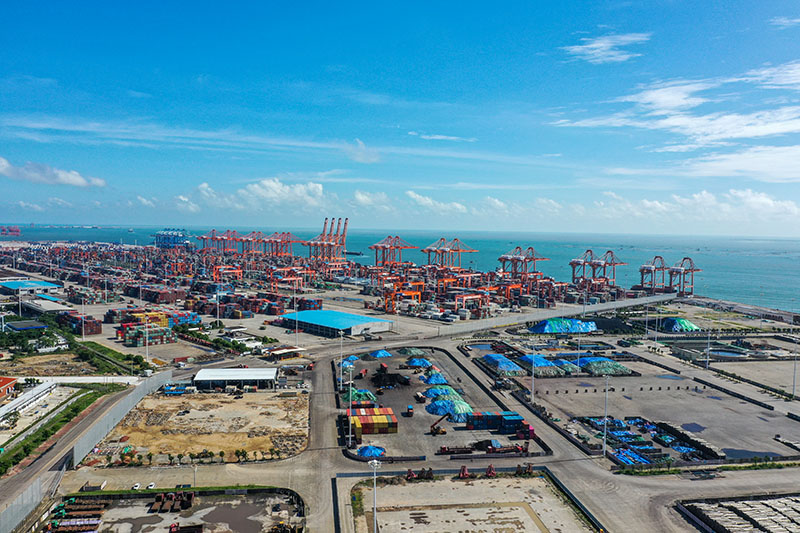這是2022年8月27日拍攝的位于平陸運河出??诟浇谋辈繛掣蹥J州港區(qū)大欖坪作業(yè)區(qū)(無人機照片)。新華社記者 曹祎銘 攝